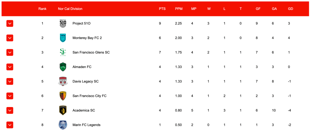 Diving into USL 2, SF City plays in the Nor Cal division, and heres the standings from May 27th: