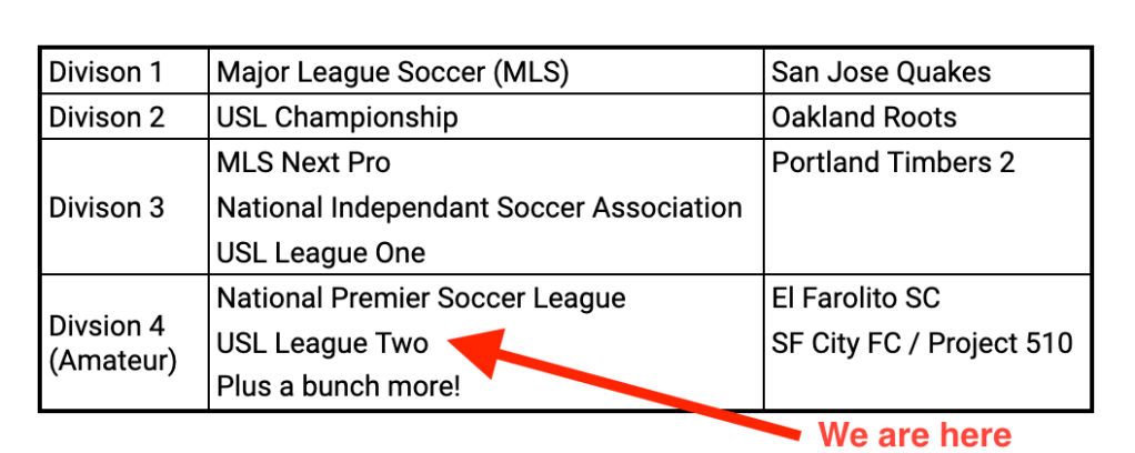 We went to their home opener a couple weekends ago to see them play against Project 51O, the Oakland team from the same division. SF City won 2-0 while looking great in their new kits. You may be asking yourself: “What league do these teams even play in?” I know I did… So I made this chart that explains Soccer in the US, including some example teams at each level.