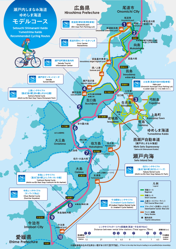 There’s actually a ton of routes and detours you can take throughout the Shimanami Kaido, but the canonical “beginner/full” route is 70 km (45 miles), starting from Onomichi and ending across the sea in Imabari. This was very doable in a day, but there’s definitely a lot more worth exploring, see map below. Following the path is pretty straightforward, as there is a painted blue line denoting the route the whole way, along with signage in English.