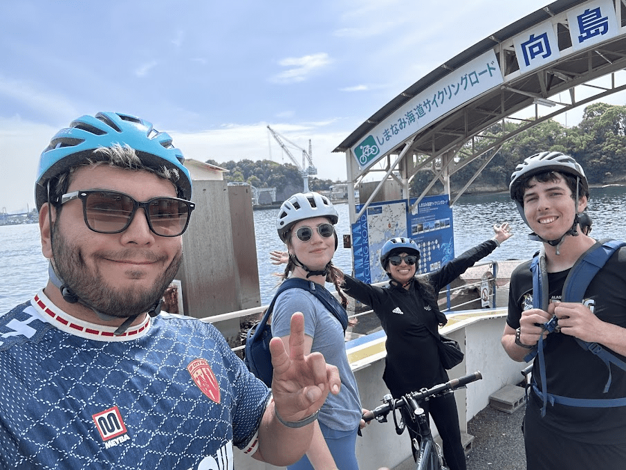 We disembarked and were off! We cycled through the small town before reaching the coast, then followed the edge of the island around until we spotted the first of the six bridges: the Innoishima Bridge. This cycling route is actually predominantly flat; over the whole day, we didn’t even hit 2,000 feet of elevation gain. This is because the majority of the route runs along the sea, with most of the elevation changes coming at each bridge’s on-ramp and off-ramp. Crossing this first bridge was super cool because bikes and motorbikes were on a lower platform by themselves, completely separate from cars. Golden Gate Bridge take notes…