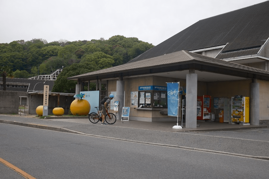 Ōmishima was our fourth island, and it featured a “Cyclist Sanctuary” rest area with a menu of citrus infused treats that were too irresistible to pass up, rain be damned. They had lemon soft serve, lemon-covered chicken and last but not least, a carbonated lemon drink. There was also a gift shop with food and merch from all the islands, along with some cycling swag. After accepting our fate to be wet the rest of the day, we headed off down the coast to cross the Ōmishima bridge to Hakatajima.